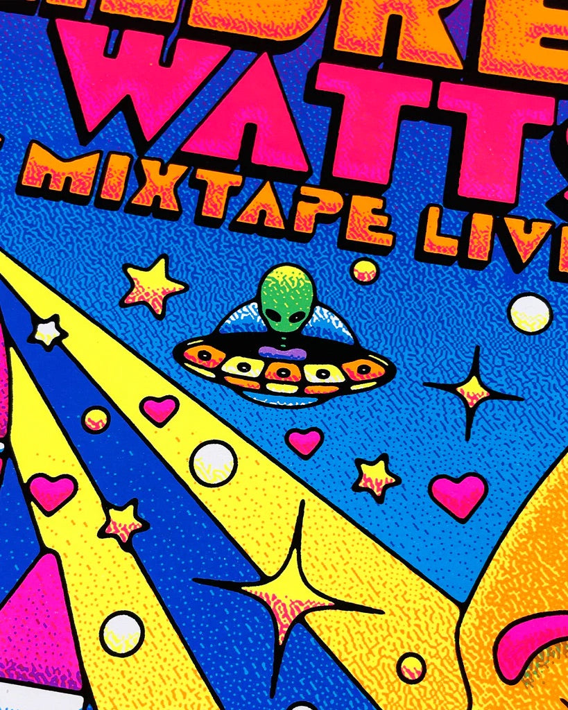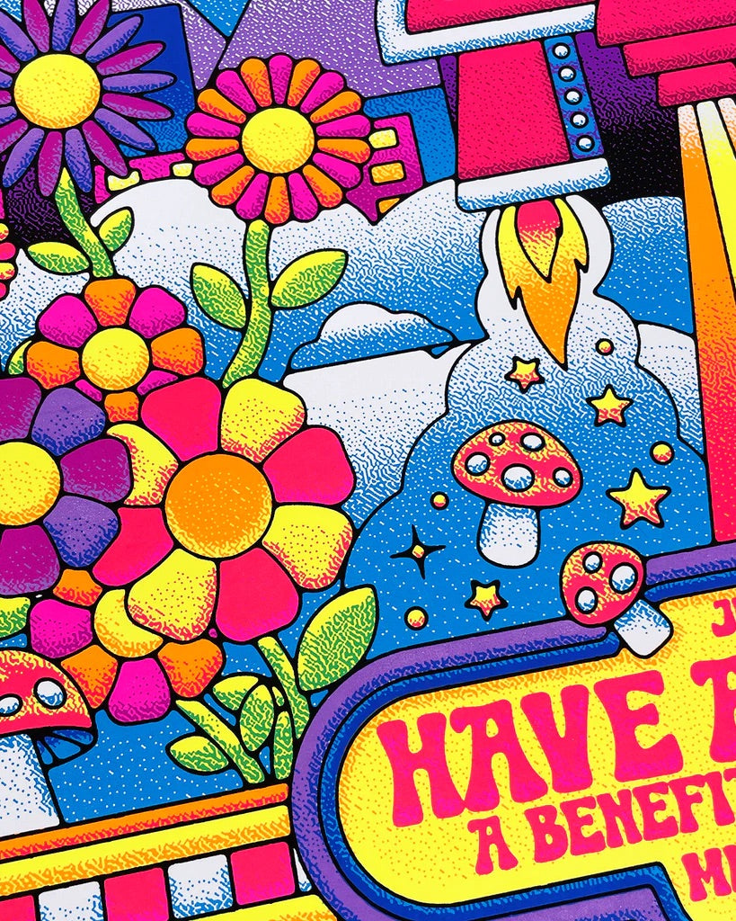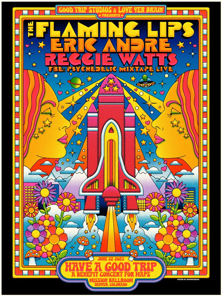 Show poster for the Have a Good Trip benefit concert for MAPS at the Mission Ballroom during the 2023 Denver Psychedelic Science conference with The Flaming Lips, Eric Andre, Reggie Watts, and Fascinated by Everything. Limited edition, numbered out of 220. Printed with fluorescent UV reactive ink. We only have a few left from our personal stash we will be selling.