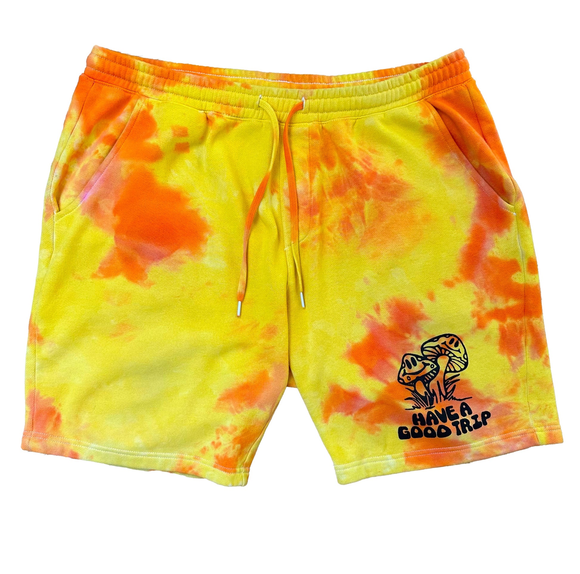Fleece jogger shorts. Black ink on orange and yellow crush dye. Hand screen printed and dyed with love. Each one is unique. Sizes S-2XL. Check size guide in product images. All sales are final. No exchanges no refunds. Have a good trip :)